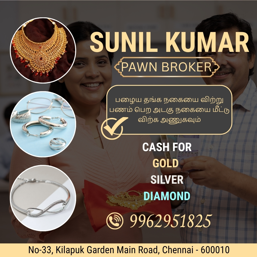At Sunil Kumar Pawn Broker, we specialize in providing quick and secure loans against gold, silver, and diamond assets. Located at No-33, Kilpauk Garden Main Road, we offer transparent services with instant cash disbursement and minimal documentation.